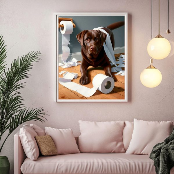 Offrez une dose d’humour à votre décoration intérieure avec cette affiche artistique et totalement décalée mettant en scène un Labrador dans les toilettes ! Idéale pour les amateurs de déco originale et les amoureux des chiens, cette illustration transforme vos sanitaires en espace fun et inattendu.
